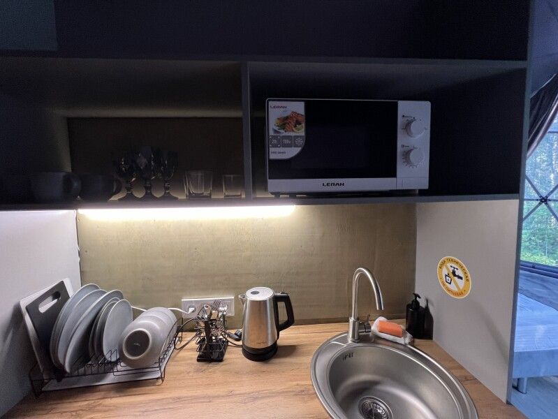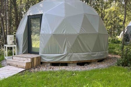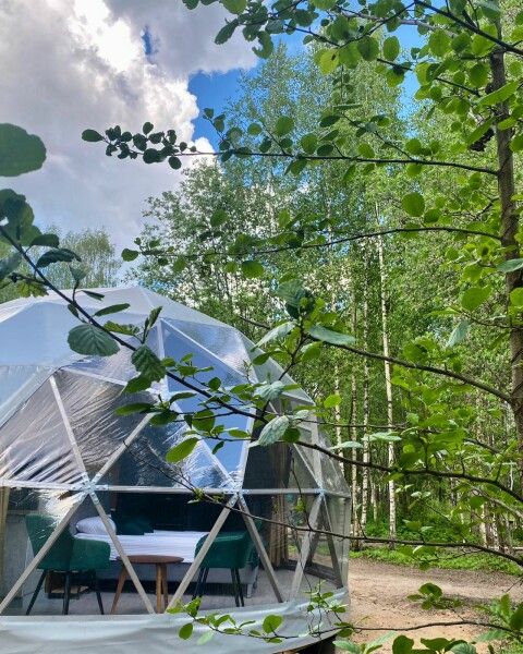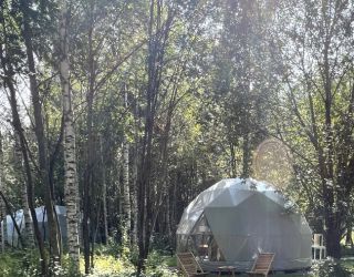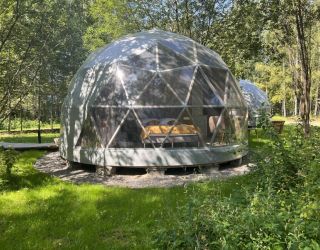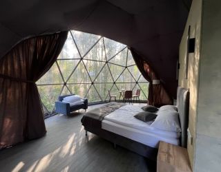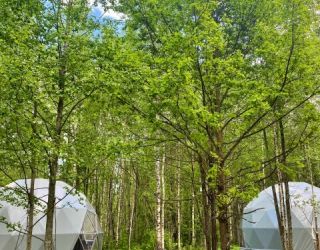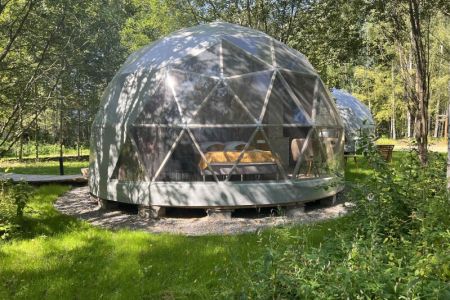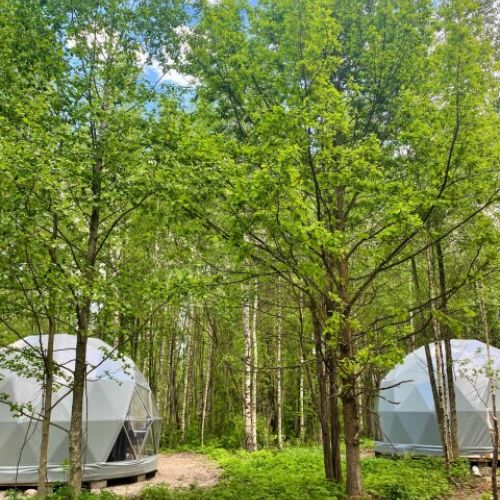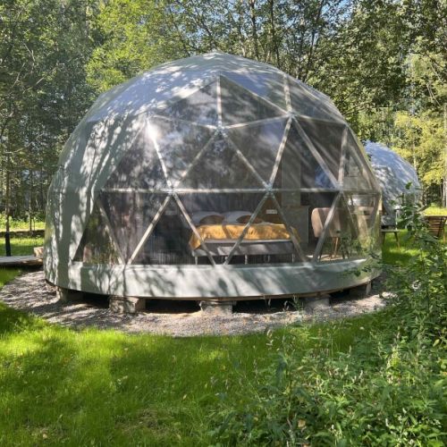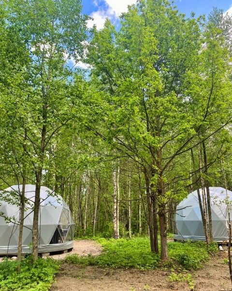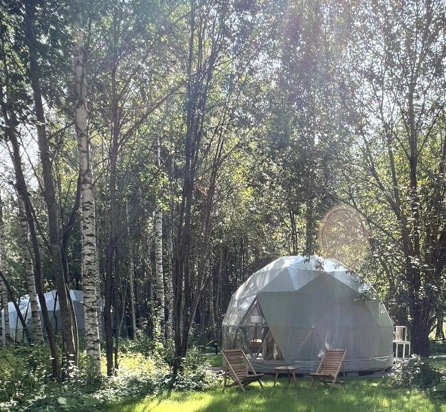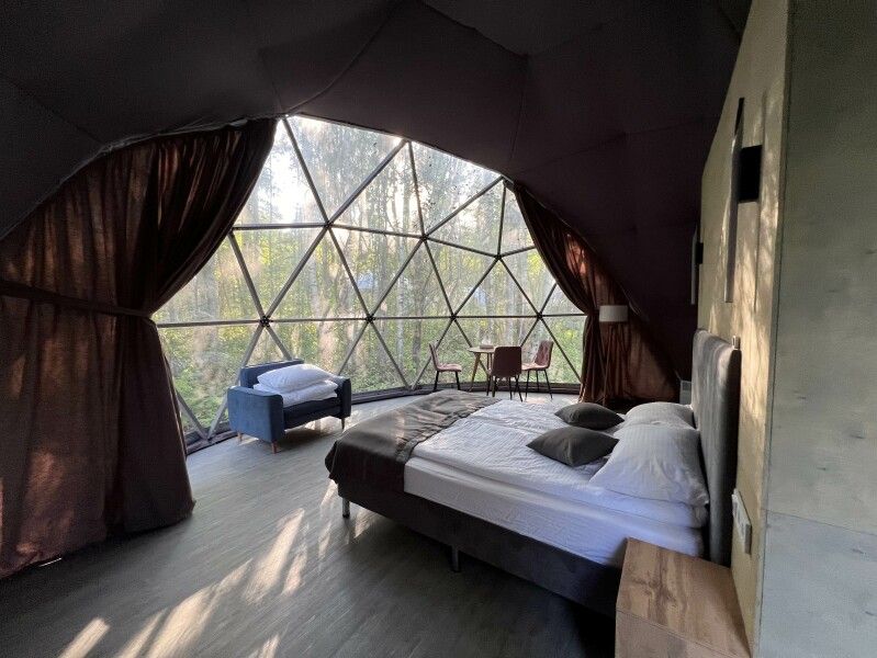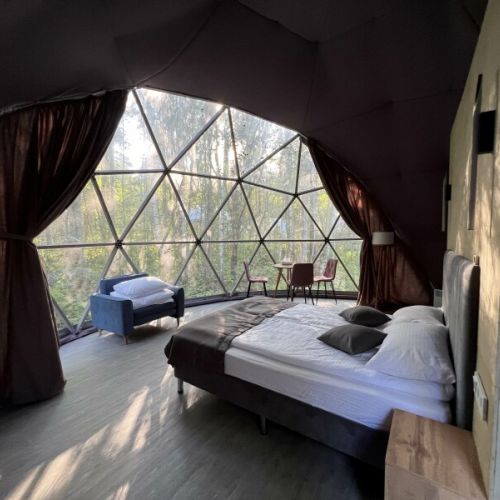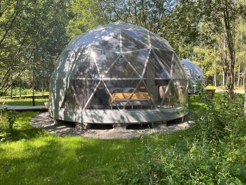 На территории глэмпинга на расстоянии более 10 метров друг от друга расположены 10 сфер с панорамными окнами. Каждая оборудована двуспальной кроватью, кухонным пространством с обеденной группой, холодильником, микроволновой печью, посудой, а также собственным санузлом с душевой и феном. Все купольные домики подходят для размещения гостей круглый год: для терморегуляции установлены кондиционер и электронагреватель. За счет внутреннего утеплителя сферы обладают достаточной звукоизоляцией. Постояльцам доступно подключение к Wi-Fi. Разрешено заселение с питомцем.