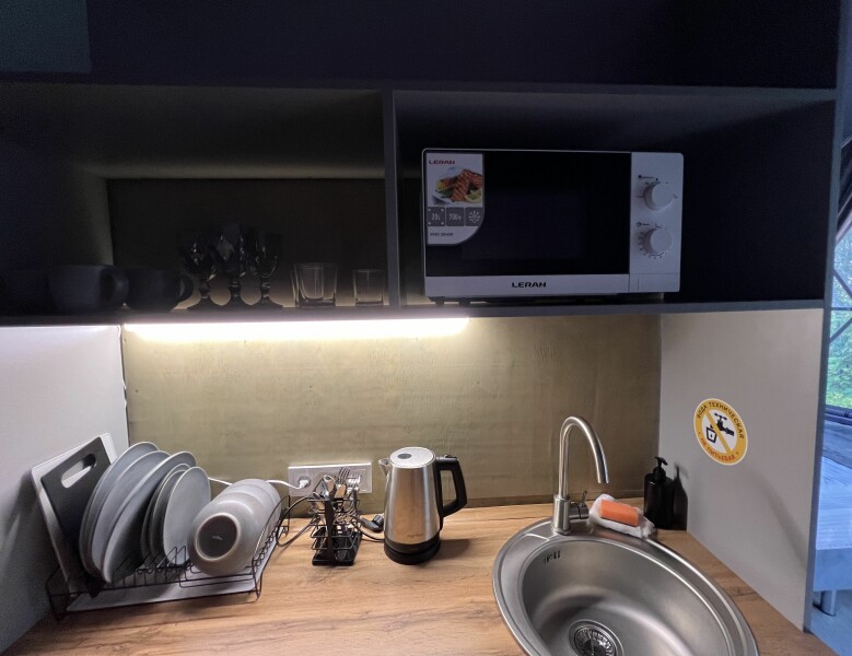 - Оборудование: кондиционер, микроволновая печь, мини-холодильник, набор посуды, чайный набор посуды, электрочайник